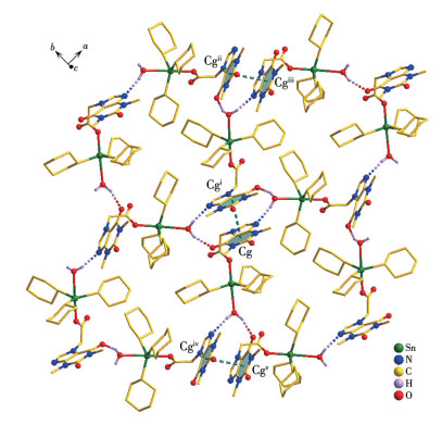 Additionally, within the crystal, the complex molecules form a 2D network structure through hydrogen bonds involving coordinated water molecules and π-π stacking interactions, as shown in Fig.2. Among these, the hydrogen bond length of H5B⋯O2 is 0.201 8(3) nm, and that of H5A⋯N2 is 0.203 6(4) nm. There are continuous and strong π-π stacking interactions between the six-membered rings on adjacent purine ring planes (Cg: C2-N3-C3-N4-C4-C5; coordinates: 0.951 83, 0.412 70, 0.913 16). The interplanar distance between adjacent planes is 0.351 8 nm, and the dihedral angle between the planes is 6.936°. Through π-π stacking and O—H⋯N hydrogen bonding, the complex forms a more stable 2D network structure.