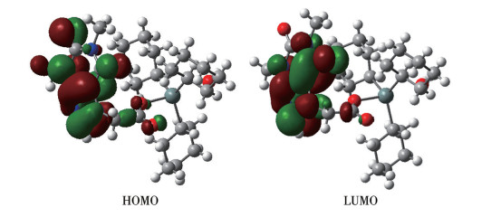 Sn1—O3 0.213 1(3) Sn—C16 0.216 0(4) Sn1—O5 0.259 8(3) Sn1—C2 0.215 8(5) Sn1—C1 0.217 2(6) O3—Sn1—C2 91.72(19) C22—Sn1—C10 113.55(18) C22—Sn1—O5 82.99(17) O3—Sn1—C16 100.04(14) C16—Sn1—C10 126.8(2) C16—Sn1—O5 79.16(14) C22—Sn1—C16 114.83(19) O3—Sn1—O5 173.65(14) C10—Sn1—O5 86.15(17) O3—Sn1—C10 99.2(2) Table 3. Calculated some frontier molecular orbitals composition of the complex at the B3LYP/LANL2DZ level