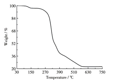 The TG curve of the complex was recorded using a TG209F3 thermogravimetric analyzer under an air atmosphere. As shown in Fig. 4, the weight loss of the complex occurred primarily in two distinct stages. In the first stage, a gradual weight loss commenced at 110 ℃ and essentially ceased by 140 ℃, resulting in a total weight loss of 3.21%. This stage is attributed to the loss of coordinated water molecules, and the observed value is in good agreement with the calculated value of 2.89%. The second stage involved the decomposition of the organic ligands: weight loss initiated at 240 ℃, progressively accelerated, then decelerated around 395 ℃, and finally stabilized near 575 ℃. The total weight loss in this stage was 74.25%, corresponding primarily to the decomposition of the tp- ligand and the cyclohexyl groups. The final residue weight stabilized at 22.54%. This residue is tentatively assigned as SnO2, which also shows reasonable agreement with the calculated value of 24.19%.