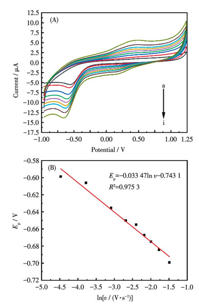 Fig. 5A shows the influence of different scan rates on the electrochemical behavior of the complex. It is seen that all curves exhibited distinct reduction peaks, with no distinct oxidation peaks appearing. This indicates that the complex undergoes a completely irreversible electrochemical reduction process. When the scan rate increased from 0.01 to 0.20 V·s-1, as seen in the figure, the peak potential gradually changed, and the reduction peak potential shifted toward the negative direction. According to the relation between peak potential (Ep) and the logarithm of scan rate (ln v) (Fig. 5B), it could be calculated that the complex undergoes an electrochemical reduction process involving one electron and one proton. This may correspond to the carbonyl group on the pyrimidine ring of the ligand obtaining a proton and becoming a hydroxyl group. The electrochemical analysis results reflect that the ligand can still maintain its electroreduction performance after coordinating with the metal center Sn.