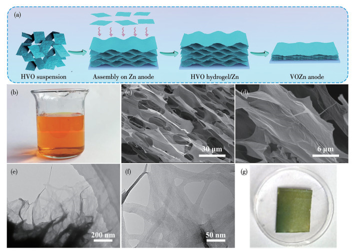 图 1. (a) VOZn负极原位自组装过程的示意图; (b) HVO悬浮液的光学照片; HVO的(c、d) SEM图和(e、f) TEM图; (g) VOZn-5的光学照片Figure 1. (a) Schematic illustration of the in-situ self-assembly process of VOZn anode; (b) Optical image of HVO suspension; (c, d) SEM and (e, f) TEM images of HVO; (g) Optical image of VOZn-5XRD分析表明,HVO的衍射图与V2O5·1.6H2O的标准卡片高度吻合,且未检测到杂相,证明了HVO的成功制备(图 2a)。此外,通过原位自组装策略,得到了一体化的VOZn负极。VOZn的XRD图中强的特征峰归属于金属锌,15°前出现的弱衍射峰则归属于HVO,表明VOZn复合结构的成功构建。图 2b为HVO和VOZn的FTIR谱图。位于526和766 cm-1处的吸收峰归属于V—O—V键;1 006和1 612 cm-1处的特征峰分别归属于V=O键和结晶水[26-27]。这些特征峰的出现证实了HVO在锌负极表面的成功构建,为观察HVO在锌表面的形貌,对VOZn-5进行了SEM表征(图 2e、2f)。结果显示,HVO均匀分布在金属锌表面,且形貌未发生明显变化。