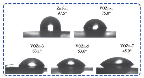 HVO具有良好的亲水性,可有效降低电极表面的锌成核能垒,促进锌的均匀沉积与剥离。因此,HVO的引入能显著改善VOZn的亲锌性。为探究复合电极对电解液的浸润性,以2 mol·L-1 ZnSO4为滴定溶液测试了锌箔及VOZn复合电极的接触角(图 3)。结果显示,原始锌箔的电解液接触角为97.5°;随着HVO自组装时间的增加,VOZn复合电极的接触角逐渐减小,表明HVO的引入显著改善了电极表面的电解液浸润性,有利于电解液离子的传输和锌的均匀沉积。