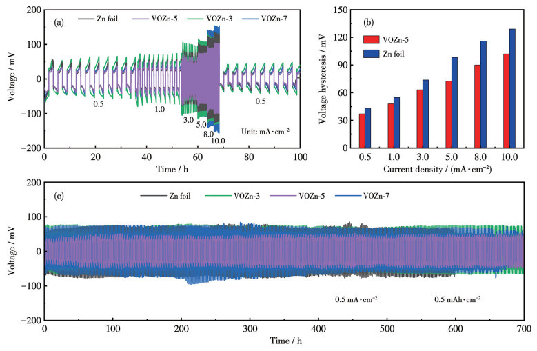 为探究HVO保护层对锌负极的保护作用,将锌箔和VOZn负极分别组装成对称电池(电解液为2 mol·L-1 ZnSO4),并进行电化学性能测试。图 5a为各对称电池在0.5、1.0、3.0、5.0、8.0、10.0 mA·cm-2的电流密度下的倍率性能曲线。Zn||Zn对称电池在97 h后电压骤降,可能是由于锌枝晶生长导致电池短路。相比之下,VOZn||VOZn对称电池在各电流密度下均表现出稳定的充放电曲线。然而,不同VOZn||VOZn对称电池的滞后电压和循环稳定性存在差异,这与HVO保护层的厚度有关。保护层过薄则难以有效抑制枝晶生长,也无法抵抗充放电过程中负极体积变化引起的破损;保护层过厚则会增加电池内阻,不利于电化学反应动力学性能的提升。因此,与基于锌箔、VOZn-3和VOZn-7电极的对称电池相比,VOZn-5||VOZn-5对称电池表现出更低的过电势(图 5b,0.5 mA·cm-2@37 mV,10.0 mA·cm-2@102 mV)和更优异的循环稳定性(图 5c,稳定循环700 h)。