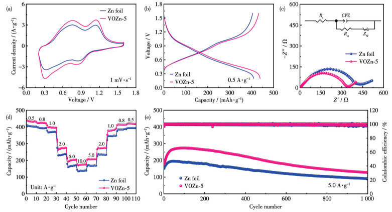 图 6. Zn||HVO/aMWCNTs和VOZn-5||HVO/aMWCNTs全电池的电化学性能: (a) 扫描速率为1 mV·s-1时的CV曲线; (b) 0.5 A·g-1下的GCD曲线; (c) Nyquist图; (d) 倍率性能; (e) 5.0 A·g-1下的长循环性能Figure 6. Electrochemical performances of the Zn||HVO/aMWCNTs and VOZn-5||HVO/aMWCNTs full cells: (a) CV curves at 1 mV·s-1; (b) GCD plots under 0.5 A·g-1; (c) Nyquist plots; (d) rate performances; (e) long-term cycling performances at 5.0 A·g-1Inset: the corresponding equivalent circuit diagram.