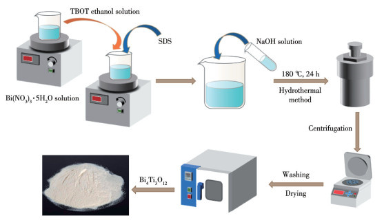 首先将五水合硝酸铋(4 mmol)和TBOT(3 mmol)分别溶于适量去离子水和无水乙醇中,搅拌均匀。然后在搅拌条件下将TBOT溶液缓慢滴加至硝酸铋溶液中,并向其中加入1.5 g不同表面活性剂(SDS或油酸钠),随后滴加NaOH溶液(3 mol·L-1,40 mL),搅拌30 min后得到前驱体溶液。将前驱体溶液放入100 mL装有聚四氟乙烯内衬的高压釜中,180 ℃水热反应24 h,反应结束后将沉淀物离心、洗涤至中性,接着在真空干燥箱内80 ℃干燥12 h,得到Bi4Ti3O12。其中添加表面活性剂SDS、油酸钠及未添加表面活性剂的3种样品分别记为BTO-1、BTO-2、BTO-3。BTO-1的制备过程如图 1所示。