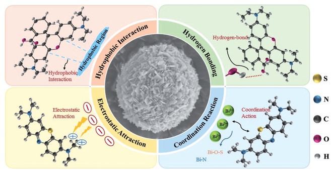 为了进一步研究有机染料溶液在Bi4Ti3O12上的吸附机理,测定了样品的接触角以及吸附染料前后的FTIR谱图,结果如图 9所示。阳离子染料MB的—NH2基团使得染料带正电,BTO-1中添加的SDS为阴离子表面活性剂,表面富含磺酸基团(—SO3H),这使BTO-1的表面负电荷增加,有助于与MB产生强静电吸引,从而增加对染料的吸附。而RhB分子中含有疏水芳香环和烷基链,BTO-2经表面活性剂油酸钠疏水改性后,接触角由33.86°(图 9c)增加到126.54°(图 9b),说明其疏水性增加。其疏水性与RhB染料分子中存在的疏水结构产生疏水相互作用,进而增强了对RhB染料的吸附[44]。MO染料为阴离子染料,表面带负电,由于静电排斥作用导致吸附性较差。如图 9d所示,BTO-1吸附MB后,FTIR谱图与原始略有不同,位于3 411、1 630 cm-1附近的特征峰略微增强,表明BTO-1表面富含的羟基作为氢键供体与作为氢键受体的MB染料分子两端的二甲铵基团(—N(CH3)2)发生氢键作用。同样,从图 9e中也观察到了BTO-2特征峰增强的现象,这主要是由于RhB中羧基(—COOH)作为氢键受体与BTO-2的羟基发生氢键作用所致[45]。值得注意的是,在BTO-1吸附MB染料分子后,Bi—O键特征峰的位置发生了略微偏移,从808 cm-1处偏移到了817 cm-1,表明MB分子中富含孤对电子的杂原子与Bi4Ti3O12表面的金属离子Bi3+发生配位作用,形成了配位键。由此可知,染料在样品上的吸附行为是多种相互作用共同影响的结果。图 10为催化剂样品吸附染料分子的吸附机理图。