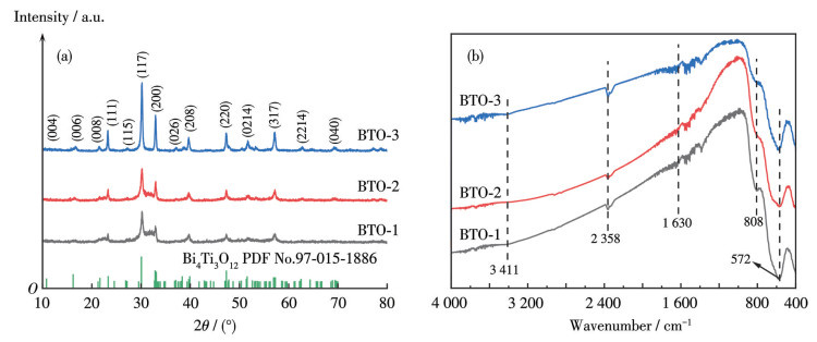 图 2a显示了在添加不同表面活性剂条件下制备的Bi4Ti3O12的XRD图。3个样品的衍射峰都与Bi4Ti3O12(PDF No.97-015-1886)对应,没有其他杂质峰,其中2θ=30.25°处的最强峰对应Bi4Ti3O12的(117)晶面。图中可以看到,未添加表面活性剂的样品BTO-3由于晶体生长不受抑制,晶粒自由生长,晶格完整性更好,因此衍射峰最强。图 2b显示了不同Bi4Ti3O12样品的FTIR谱图。所有样品在3 411、2 358、1 630、808、572 cm-1处均存在吸收峰。其中,在808 cm-1处的强吸收峰对应于Bi—O的伸缩振动;在572 cm-1处较宽的吸收峰归因于Ti—O的伸缩振动;在2 358 cm-1处的特征峰归属于CO32-的反对称伸缩振动,说明材料表面存在CO32-;在3 411和1 630 cm-1处的弱峰分别是表面吸附水中O—H的反对称伸缩振动和弯曲振动。以上结果与XRD图结果一致,表明合成的产物为Bi4Ti3O12粉体。