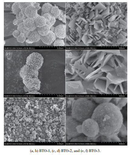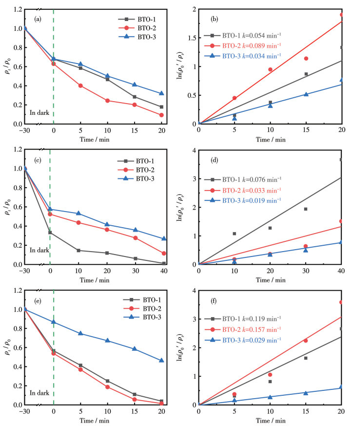 其中,ρ0′和ρt分别是染料暗吸附后的初始质量浓度和光催化反应t时的质量浓度(mg·L-1),k是反应速率常数(min-1)。如图 5b所示,BTO-2的催化降解反应速率最快(k=0.089 min-1),比BTO-3的(0.034 min-1)高1.6倍,而BTO-1的k为0.054 min-1,比BTO-3的高0.6倍。