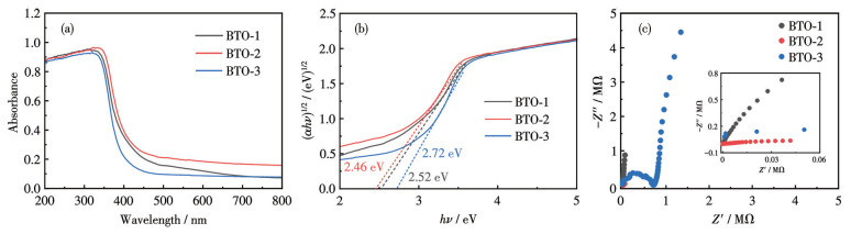 通过UV-Vis吸收光谱表征了Bi4Ti3O12样品的光学性质。由图 4a可以看出所有样品在紫外光区内均有明显的吸收边,BTO-1、BTO-2、BTO-3的吸收边分别位于414、430、407 nm处,添加表面活性剂的样品吸收边表现出了红移现象,说明其在全光谱中的利用率增高。根据(αhν)1/2-hν曲线[26]计算得到BTO-1、BTO-2、BTO-3的带隙(Eg)分别为2.52、2.46、2.72 eV(图 4b)。相比较未添加表面活性剂的样品,添加SDS和油酸钠所制备的BTO-1、BTO-2的Eg减小。原因是表面活性剂通过抑制成核,促进晶体有序生长,引起晶粒尺寸增大,而晶体尺寸的增大使得Eg减小[27],由此可知Eg随样品形貌的变化而变化。通过EIS对光生载流子的分离和传输性能进行了研究。如图 4c所示,BTO-2的阻抗圆弧半径较小,说明其电荷转移电阻最小,电荷分离效率更高。