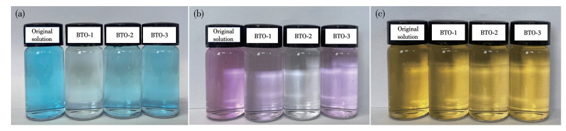 光催化降解实验中发现样品对染料溶液的吸附能力很强,为此,重新选取了相同质量浓度的染料溶液以探究催化剂的吸附机理。由图 8可知,对于5 mg·L-1 MO、MB、RhB溶液,经30 min吸附反应后,样品对不同的染料吸附情况也大不相同。其中,在MB溶液(图 8a)中,BTO-1的吸附效果明显优于其他2种样品;在RhB溶液(图 8b)中,BTO-2表现出了最优异的吸附效果,肉眼可以看到,溶液已接近于透明色。而所有样品对于MO溶液(图 8c)的吸附效果相差不大。这主要是由于Bi4Ti3O12对染料溶液的吸附涉及多种作用的协同效应。通过不同表面活性剂对样品进行修饰,使得催化剂表面富含众多的官能团(图 2b),这可以为吸附过程提供作用位点,从而有利于通过氢键、静电相互作用、范德瓦耳斯力、疏水相互作用等作用力对染料分子进行吸附[42]。Bi4Ti3O12的层状钙钛矿结构赋予了其丰富的表面活性位点,如Bi3+、Ti4+及氧空位。在接近中性或弱碱性的实验条件下,催化剂表面带负电荷[43]。此时,阳离子染料RhB和MB因表面带正电荷,能够通过静电作用与催化剂表面高效吸引,从而有利于吸附过程的进行;相反,阴离子染料MO在相同条件下因表面带负电荷,与催化剂之间产生静电排斥作用,导致其吸附效率降低。