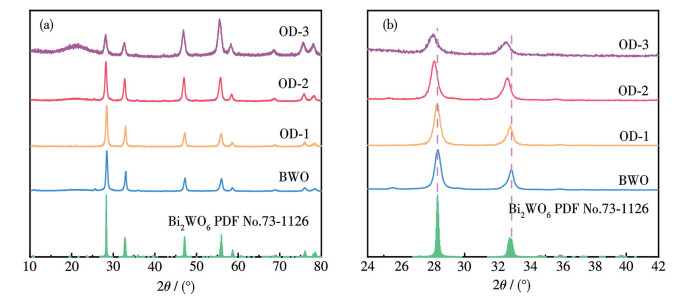 The crystallinity and phase composition of the synthesized samples were characterized by XRD. As illustrated in Fig.1a, the diffraction peaks of the BWO, OD-1, OD-2, and OD-3 samples all matched well with the standard card of Bi2WO6 (PDF No.73-1126) and no other impurity diffraction peaks were detected[15], confirming that the pure-phase Bi2WO6 catalyst was successfully synthesized. The enlarged XRD patterns in the 2θ range of 24°-42° (Fig.1b) revealed that, as the amount of EG increased, the diffraction peaks shifted toward lower angles and the full width at half maximum increased slightly. This phenomenon is attributed to the change of crystal compressive stress state and lattice distortion, indicating the presence of the disordered structure[16].