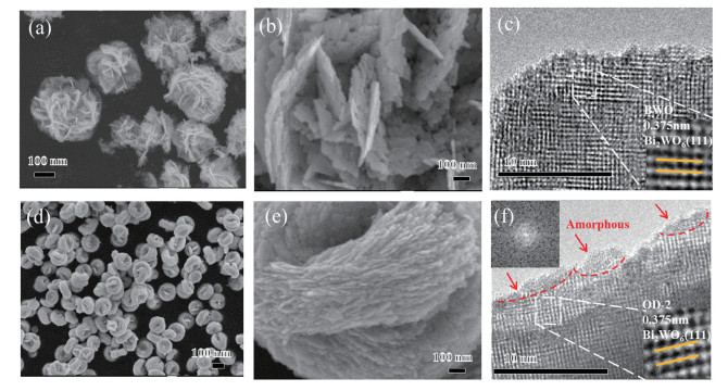 Figure 2  SEM images of (a, b) BWO and (d, e) OD-2; TEM and HRTEM images of (c) BWO and (f) OD-2
