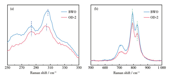 Figure 4  Raman spectra of as-synthesized BWO and OD-2 in the range of (a) 250-350 cm-1 and (b) 500-1 000 cm-1