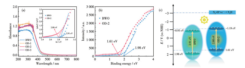 Figure 6.  (a) UV-Vis DRS of as-synthesized samples; (b) VB-XPS spectra of BWO and OD-2; (c) Schematic diagram of the energy band structure of BWO and OD-2