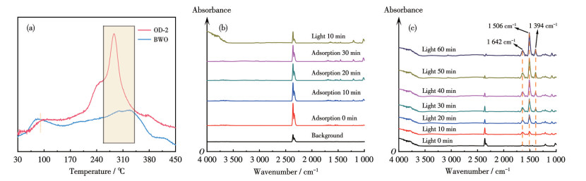 Figure 7.  (a) N2-TPD profiles of BWO and OD-2; (b) In-situ DR-FTIR spectra of N2 and H2O adsorption blank experiment of OD-2 (no light condition); (c) In-situ DR-FTIR spectra of full light simulation reaction process of OD-2