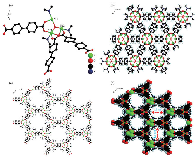 Diffraction data for Ni3-MOF were collected on a Bruker SMART CCD diffractometer (Cu Kα radiation, λ=0.156 04 nm) in Φ-ω scan modes. The anisotropic displacement parameters were applied to all non- hydrogen atoms in full-matrix least-squares refinements based on F2 were performed using SHELXL-2013. The structure was solved by direct methods and refined using the Olex2 program[27]. Anisotropic thermal parameters were assigned to all non-hydrogen atoms. The hydrogen atoms were placed at calculated positions and refined as riding atoms with isotropic displacement parameters. The disordered carbon atoms on dimethylamine and the aromatic rings of the L2- in the structure of Ni3-MOF were refined using appropriate techniques. Crystallographic crystal data and structure processing parameters for Ni3-MOF are summarized in Table 1. Selected bond lengths and bond angles for Ni3-MOF are listed in Table 2.
