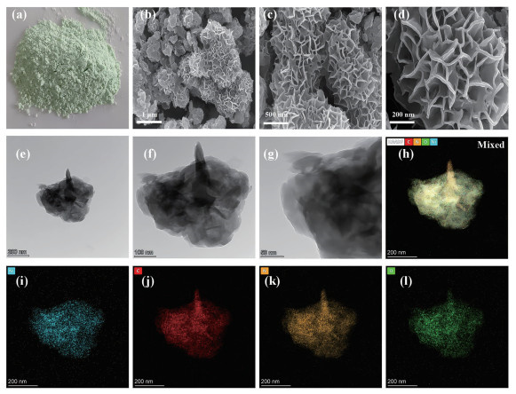 Nanoscale MOF adsorbents generally exhibit superior adsorption performance compared to their bulk crystalline counterparts. This is because reducing MOFs from bulk crystals to the nanoscale involves not only a change in physical size, but also a comprehensive unlocking of their adsorption potential as porous materials, achieved by shortening diffusion pathways, increasing the accessibility of active sites, and enhancing mass transfer efficiency. As a result, they demonstrate superior performance in adsorbing pollutants from wastewater. Based on this, the present study employed a mechanical fragmentation method using a cell disruptor to treat Ni3-MOF crystals, successfully obtaining the nanoscale adsorbent Ni3-MOF-N (Fig.2a). SEM (Fig.2b-2d) and TEM (Fig.2e-2g) observations revealed that the particle size of Ni3-MOF-N was approximately 200 nm. EDS mapping analysis (Fig.2h-2l) confirmed that the material is primarily composed of four elements: Ni, C, N, and O.