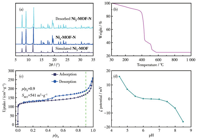 PXRD patterns (Fig.3a) confirmed that Ni3-MOF-N retains the crystalline structure of the bulk Ni3-MOF. TGA (Fig.3b) showed that Ni3-MOF-N lost the coordinated dimethylamine molecules from its structure in the temperature range of 30-430 ℃. When the temperature exceeded 430 ℃, the L2- ligands in the framework began to decompose, ultimately leaving approximately 25.07% of NiO as the residue. The N2 adsorption-desorption isotherm (Fig.3c) exhibited a typical type-Ⅱ shape, with a specific surface area, pore volume, and average pore size of 541 m2·g-1, 0.022 61 cm3·g-1, and 13.31 nm, respectively. The experimentally measured pore volume and pore size were both smaller than the theoretical values, which further provides indirect evidence for the presence of free counterions in the Ni3-MOF structure. Furthermore, ζ potential, which significantly influences the adsorption capacity between the adsorbent and pollutants through electrostatic interactions, was measured for Ni3-MOF-N under different pH conditions. The results (Fig.3d) indicated an isoelectric point at approximately pH=6.50. Thus, the surface of the material is positively charged at pH values below 6.50 and negatively charged at pH values above 6.50. It is generally acknowledged that adsorbents often exhibit optimal adsorption performance near their isoelectric point[29].