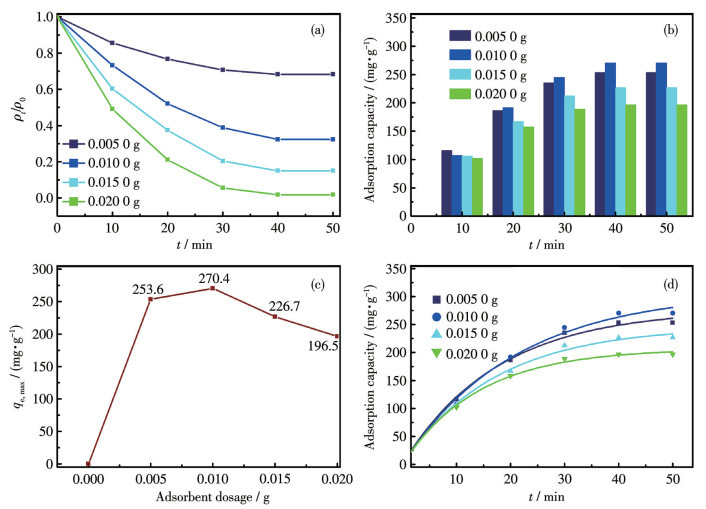 The effect of Ni3-MOF-N dosage on the adsorption of TC was systematically investigated at 25 ℃ and pH=7.00. The experimental results (Fig.4) indicate that when using a 100 mL 40 mg·L-1 TC solution, the adsorption process reached equilibrium within 40 min. It is noteworthy that the adsorbent dosage significantly influenced the removal efficiency of TC. Specifically, when the dosages of Ni3-MOF-N were 0.005 0, 0.010 0, 0.015 0, and 0.020 0 g, the corresponding TC removal efficiencies after 40 min (Fig 4a) were 31.72%, 67.60%, 85.01%, and 98.25%, respectively, with average adsorption rates of 0.317 1, 0.676 0, 0.850 1, and 0.982 5 mg·L-1·min-1, respectively. Under these conditions, the measured equilibrium adsorption capacities (Fig.4b and 4c) were 253.6, 270.4, 226.7, and 196.5 mg·g-1, respectively. Kinetic analysis revealed that the adsorption behavior of TC onto Ni3-MOF-N followed the pseudo-first-order kinetic model (R2 > 0.992 5) (Fig.4d). The fitted theoretical adsorption rates under different dosages were 0.048 09, 0.057 06, 0.058 48, and 0.071 32 g·mg-1·min-1, respectively. These results are consistent with the experimental observation that the adsorption rate increased with higher adsorbent dosage. Meanwhile, the theoretical equilibrium adsorption capacities derived from the pseudo-first-order model were 227.2, 308.6, 246.8, and 207.2 mg·g-1, respectively. Combining the experimental data and kinetic fitting results, Ni3-MOF-N exhibited optimal adsorption performance toward TC at a dosage of 0.010 0 g. Therefore, for an initial TC concentration of 40 mg·L-1, the optimal dosage of Ni3-MOF-N is ρ=0.100 0 g·L-1.