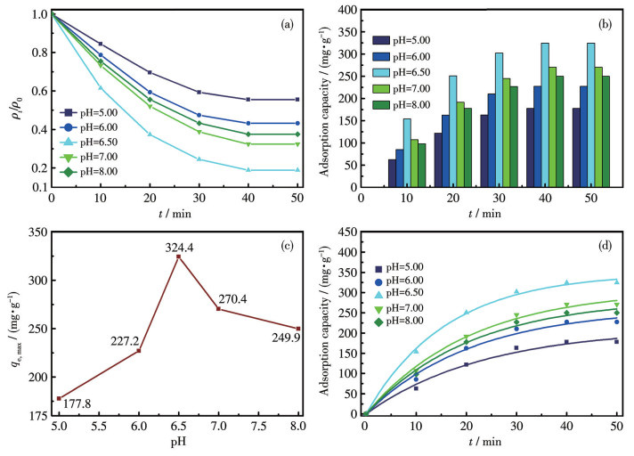 Under experimental conditions of 25 ℃ and a fixed Ni3-MOF-N dosage of 0.010 0 g, the effect of solution pH on its TC adsorption performance was systematically investigated. As shown in Fig.5, the solution pH exerted a pronounced influence on the adsorption behavior of TC by Ni3-MOF-N. Under different pH conditions (5.00, 6.00, 6.50, 7.00, 8.00), the adsorption reactions reached equilibrium within 40 min (Fig.5a). At equilibrium, the removal efficiencies of TC were 45.45%, 56.79%, 81.09%, 67.60%, and 62.48%, respectively, with corresponding average adsorption rates of 0.444 5, 0.567 9, 0.810 9, 0.676 0, and 0.624 8 mg·L-1·min-1. The calculated actual equilibrium adsorption capacities (Fig.5b and 5c) were 177.8, 227.2, 324.4, 270.4, and 249.9 mg·g-1, respectively. Adsorption kinetics analysis indicated that the process followed the pseudo-first-order kinetic model (R2 > 0.984 4) under all pH conditions. The theoretical adsorption rates obtained from the model fitting were 0.042 48, 0.047 20, 0.062 52, 0.048 09, and 0.047 99 g·mg-1·min-1, and the theoretical maximum adsorption capacities were 211.8, 262.1, 348.3, 308.6, and 285.6 mg·g-1, respectively. Notably, when the solution pH was 6.50 (the isoelectric point of Ni3-MOF-N), both the experimentally measured and model-fitted adsorption capacities reached their maximum values, at 324.4 and 348.3 mg·g-1, respectively. This phenomenon can be attributed to the coupling effect between the speciation distribution of TC and the surface charge of the adsorbent. Within the pH range of 3.30-7.70, TC primarily exists as an electrically neutral zwitterionic species. When pH < 6.50, the surface of Ni3-MOF-N is positively charged, and a high concentration of H+ competes with TC for adsorption sites, leading to reduced adsorption capacity. Conversely, when pH > 6.50, the surface of Ni3-MOF-N becomes negatively charged. However, as the pH increases beyond 7.70, TC gradually deprotonates into an anionic form (TC-), and OH- also competes for surface adsorption sites, resulting in a decline in adsorption performance.
