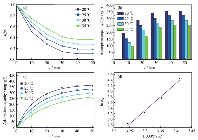 Under the conditions of a Ni3-MOF-N dosage of 0.010 0 g and a solution pH of 6.50, the effect of temperature (20, 25, 30, and 35 ℃) on its TC adsorption performance was systematically investigated. The experimental results (Fig.6) demonstrated that temperature significantly influenced the adsorption behavior of TC onto Ni3-MOF-N. At 20 ℃, the adsorption process reached equilibrium within 40 min, with a TC removal efficiency of 89.54% (Fig.6a). Similarly, at 30 and 35 ℃, adsorption equilibrium was also achieved within 40 min, with removal efficiencies of 71.93% and 63.16%, respectively (Fig.6a). Notably, the adsorption capacity (in terms of removal efficiency) at 20 ℃ was higher than that at 25 ℃ (81.09%), while the adsorption performance at 30 and 35 ℃ was lower than that at 25 ℃. Overall, within the temperature range of 20-35 ℃, the adsorption capacity of Ni3-MOF-N for TC decreased with increasing temperature. The corresponding average adsorption rates at 20, 25, 30, and 35 ℃ were 0.895 4, 0.810 9, 0.719 3, and 0.631 6 mg·L-1·min-1, respectively. This phenomenon can be attributed to the enhanced thermal motion of molecules in the solution at higher temperatures, which reduces the probability of effective contact and adsorption between TC and the active sites on the Ni3-MOF-N surface. Consequently, as shown in Fig.6b, the maximum equilibrium adsorption capacities of Ni3-MOF-N for TC at 20, 25, 30, and 35 ℃ were 358.2, 324.4, 287.7, and 252.6 mg·g-1, respectively.