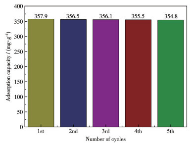 Cyclic adsorption experiments for TC were conducted using Ni3-MOF-N under the conditions of 20 ℃, pH 6.50, and an adsorbent dosage of 0.010 0 g. The results (Fig.7) demonstrated that the maximum equilibrium adsorption capacity in the first cycle was 357.9 mg·g-1, with an adsorption efficiency of 99.92%. In the second cycle, the maximum equilibrium adsorption capacity was 356.5 mg·g-1, with an efficiency of 99.53%. Even after five cycles, the material maintained an adsorption capacity of 354.8 mg·g-1 and an efficiency of 99.05%. The recycling experimental results indicate that Ni3-MOF-N exhibited excellent structural stability and reliable adsorption performance over multiple adsorption/desorption cycles. Therefore, this material shows great potential for practical applications in removing TC-based organic pollutants from water bodies.