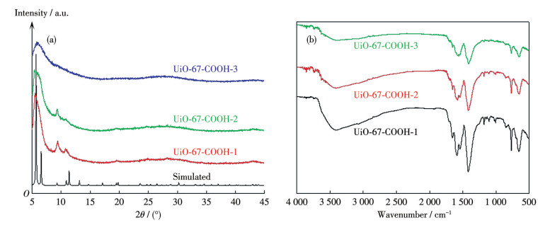 Figure 1  (a) XRD patterns and (b) FTIR spectra of UiO-67-COOH
