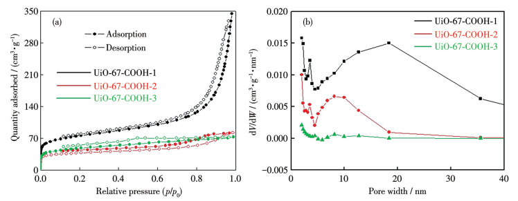 Figure 2  (a) N2 adsorption-desorption isotherms and (b) BJH pore size distributions of UiO-67-COOH
