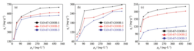 图 4.  UiO-67-COOH对(a) CR、(b) MO和(c) AO7的吸附容量