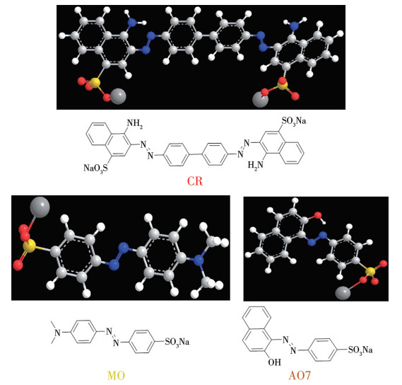 多孔配位聚合物由于具备大的吸附空间和位点[28-33],是一类在去除有害染料领域被广泛应用的吸附材料。为了研究UiO-67骨架中的—COOH对吸附性能的影响,3种阴离子偶氮染料CR、MO和AO7被用于吸附动力学和热力学研究。吸附实验中,吸附剂的质量为5 mg,染料溶液的体积为50 mL。图 4是制备的吸附剂对3种染料的吸附容量随其质量浓度的变化图。从图 4可以看出,UiO-67-COOH-1、UiO-67-COOH-2和UiO-67-COOH-3对CR的最大吸附容量分别为698.7、614.8和569.7 mg·g-1;对MO的最大吸附容量分别为295.9、272.8和253.9 mg·g-1;对AO7的最大吸附容量分别为200.8、181.9和121.5 mg·g-1。吸附结果表明,随着—COOH在UiO-67骨架中的增加,3种染料的吸附容量均呈现出逐渐降低的趋势。其中,—COOH含量的变化对AO7吸附容量的影响更为显著。这些结果表明,吸附剂的吸附性能与染料分子的结构密切相关。3种染料结构差异明显:CR比MO和AO7携带更多的负电荷,并含有更为丰富的芳香环结构;CR和MO具有线性分子构型,而AO7则属于非线性分子。如图 5所示,3种染料分子的尺寸大小顺序为CR > MO > AO7。染料分子的结构特征和尺寸大小对吸附剂的吸附性能有着不可忽视的影响,这主要是因为这些差异可能会影响染料分子在孔道内的排布,并且对吸附染料和吸附剂之间的吸附作用(如静电作用、π-π相互作用和氢键作用)产生调控。结果表明,吸附剂对CR的吸附效率明显高于MO和AO7,这是因为CR和吸附剂之间的静电、π-π和氢键作用强度大于其他2种染料分子。然而,由于AO7为非线性分子,在吸附过程中会受到空间位阻效应的制约,从而导致吸附剂对AO7的吸附容量最小。然而,UiO-67-COOH-1吸附剂对CR、MO和AO7的吸附容量比用类似方法合成的UiO-67(合成时,有机配体为43.2 mg H2BPDC,其他条件相同)对这3种染料的吸附容量(CR:673.9 mg·g-1,MO:244.2 mg·g-1,AO7:181.8 mg·g-1,图S4)分别提高了3.7%、21.2%和10.5%。这可能由于在较大的吸附空间下,氢键作用对于染料吸附的影响大于空间位阻作用的影响。相反,UiO-67-COOH-2和UiO-67-COOH-3吸附剂对3种染料的吸附容量小于UiO-67对3种染料的吸附容量,这可能是由于在较小的吸附空间下,氢键对于吸附性能的影响小于空间位阻的影响。