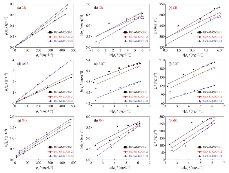 我们针对UiO-67-COOH对阴离子染料的吸附动力学展开了研究。在实验过程中,CR、MO和AO7的质量浓度分别设定为100、20和20 mg·L-1。如图S8所示,在约80 min时,3个染料分子的吸附达到平衡。我们采用准一级和准二级动力学模型来描述吸附动力学行为。如图S5所示,准一级动力学模型的线性回归系数明显小于准二级动力学模型,这表明吸附动力学符合准二级模型。所有相关参数列于表S1~S3。在吸附热力学行为研究方面,Freundlich、Langmuir和Temkin这3个模型被广泛应用于分析吸附过程。基于吸附平衡实验数据,绘制了这3个热力学模型的线性关系图(图 7)。综合图 7和表S1~S3的结果可以发现,Langmuir模型的R2值大于其他2个模型,这表明Langmuir模型能更好地描述实验数据,同时也表明3种染料在UiO-67-COOH上的吸附是单层的。根据Langmuir热力学模型计算出UiO-67-COOH-1对CR的最大吸附容量为709.2 mg·g-1。此外,我们对吸附剂的稳定性和可循环使用性进行了研究。UiO-67-COOH-1对CR的吸附循环使用5次后(图S9),吸附容量仍大于85%,这表明该吸附剂具有较好的稳定性和可循环使用性。