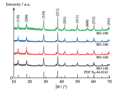 图 2为MO-140、MO-160、MO-180和MO-190的XRD图。所有衍射峰都可以与四方相α-MnO2(PDF No.44-0141)的特征峰对应,其中12.76°、18.13°、28.73°、37.58°、49.85°和60.14°附近的峰分别对应(110)、(200)、(310)、(211)、(411)和(512)晶面,无其他杂质峰出现。不同温度合成样品的特征峰位置和强度没有发生明显的变化,说明所有样品的层间距与结晶度较为接近,且纯度高[13]。