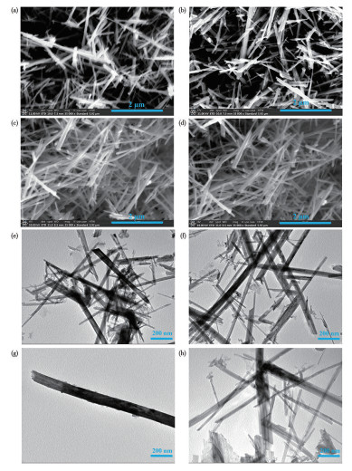 从图 3a~3d的SEM图中可以观察到所有α-MnO2均呈纳米线结构且交错分布,纳米线的长度为3~5 μm,宽度约为50 nm。这表明合成温度不影响α-MnO2的基本形貌[14]。从图 3e~3h的TEM图中可以看到不同α-MnO2纳米线在尺寸上相近且交错分布,这种类似隧道结构的形貌有利于充放电过程中电解液的渗透和离子的迁移[22]。