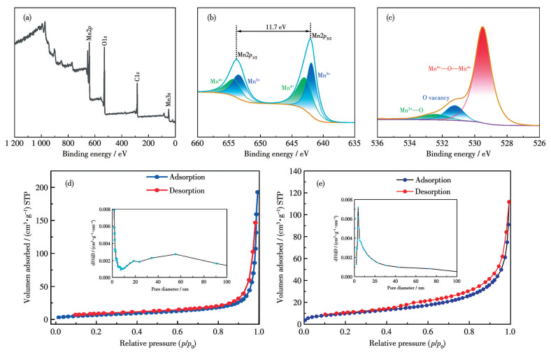 进一步采用XPS和N2吸附-脱附测试分析样品的元素价态及孔径分布。图 4a是MO-180的XPS全谱图,从中可以观察到Mn和O元素的存在。图 4b是MO-180的Mn2p XPS谱图,Mn2p1/2和Mn2p3/2结合能分别位于653.8和642.1 eV,结合能差为11.7 eV[23]。进一步分峰拟合可以发现,Mn元素是以Mn3+和Mn4+的形式存在,Mn价态的不同有利于电化学性能的提高。MO-180的O1s谱图如图 4c所示,529.5、531.3和532.9 eV处的3个特征峰分别对应Mn4+—O—Mn4+(金属氧化物)、氧空位和MnOOH的Mn3+—O[24]。