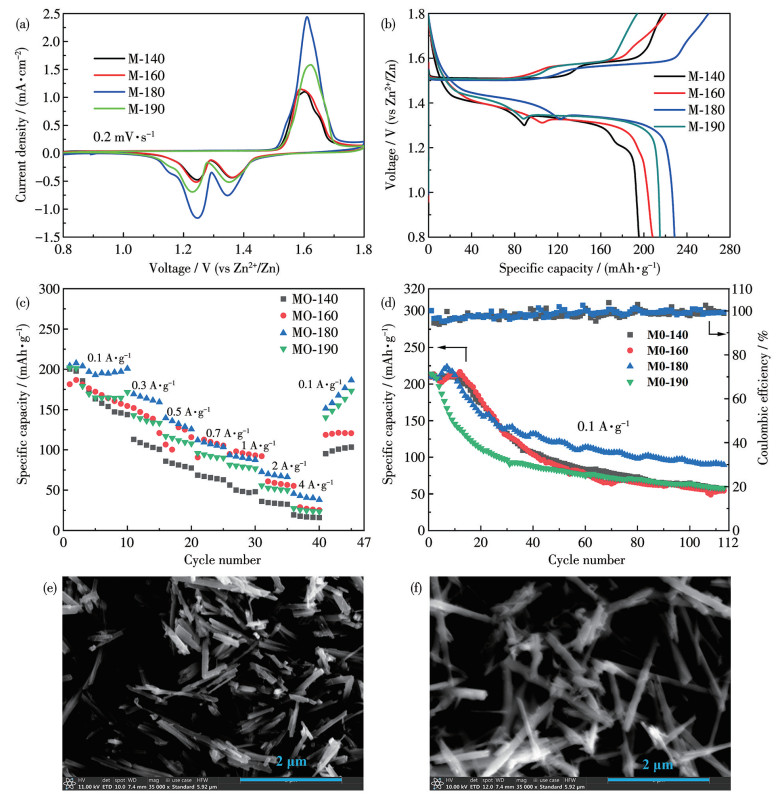 GCD测试结果如图 5b所示。由图可知,在0.1 A·g-1的电流密度下4个样品的充放电曲线相似。以MO-180放电曲线为例,其在1.30~1.45 V附近出现第1个放电平台,这与H+的嵌入有关,而在1.34 V附近出现第2个放电平台,这与Zn2+的嵌入有关[30]。M-140、M-160、M-180、M-190的放电比容量依次是195.8、208.8、229.2和218.7 mAh·g-1,其中MO-180的放电比容量最高。