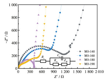 MO-140、MO-160、MO-180和MO-190的EIS如图 6所示,插图为拟合的等效电路,其中,Rct为电荷转移电阻,Rs代表电池内阻,Cd代表电容,ZW是扩散电阻。图中高频区的半圆代表的是电荷转移电阻,半圆的直径越小则电荷转移电阻越小[32];低频区的直线代表的是扩散电阻,斜率越大说明电阻越小。由图可知,MO-180的EIS拥有更小的半圆直径及更陡峭的直线。经等效电路图拟合得出MO-140、MO-160、MO-180和MO-190的电荷转移电阻分别为1 238、1 022、403和778 Ω。比较发现,MO-180的电荷转移电阻和扩散电阻均小于其他样品,这说明MO-180在充放电过程中,Zn2+和H+的嵌入和析出所受到的阻碍更小,电化学性能更优异[33]。值得注意的是,在温度继续升高时MO-190的电化学性能反而有所下降。从图 6可以观察到,MO-190的电荷转移电阻及扩散电阻均大于MO-180。这可能是因为M-190的纳米线比M-180的细小,比表面积进一步增大,导致与电解液的浸润面积变大,从而加剧不必要的副反应[34],最终导致电荷转移电阻以及扩散电阻增大(图 3g、3h)。