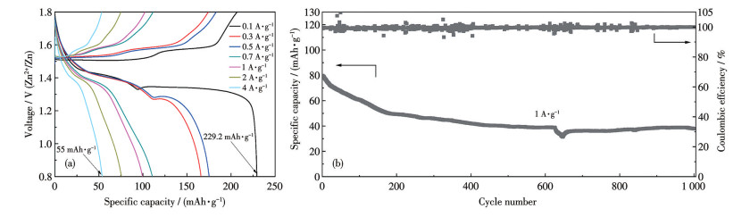 图 7是MO-180在不同电流密度下的首次GCD曲线及在1 A·g-1的大电流密度下的循环寿命曲线。随着电流密度的增大,MO-180的2个放电平台均在缩短,特别是代表Zn2+嵌入的第2个放电平台在0.7 A·g-1时已经消失,在电流密度大于0.7 A·g-1时,MO-180的放电比容量均由H+的嵌入所贡献[35]。随着电流密度的增大,Zn2+和H+的嵌入都受到了不同程度的阻碍,但由于H+的扩散能力强于Zn2+,所以第1个放电平台在4 A·g-1的高电流密度下依然存在[36]。