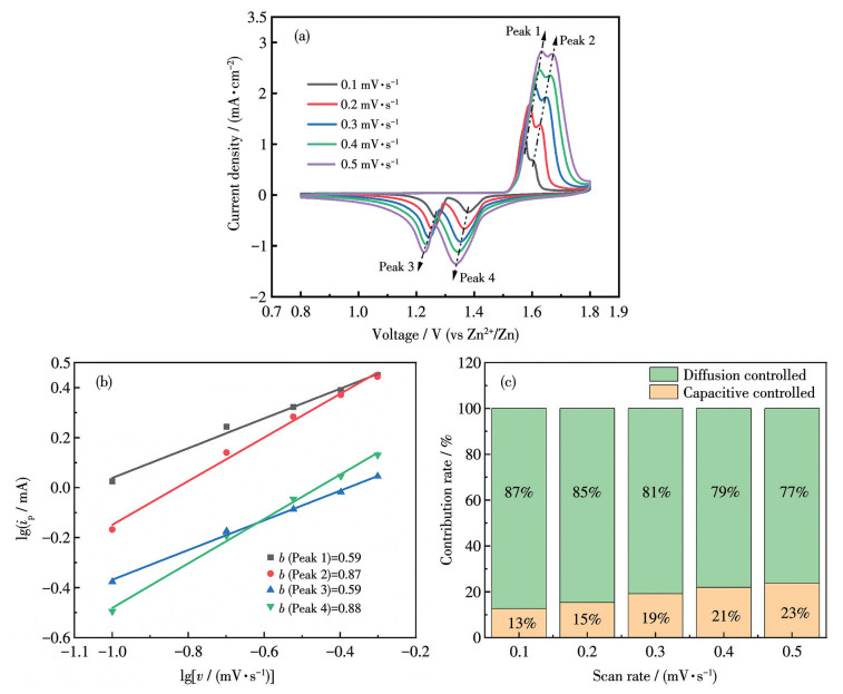 正极材料对容量的贡献分为扩散控制和电容控制贡献2种,为探求MO-180的容量贡献形式,利用公式ip=avb来判断[39],其中ip为峰值电流,v为扫描速率,a和b是常数。当b更接近0.5时,容量主要由扩散控制贡献;当b更接近1时,容量取决于电容控制。由图 8b可知,MO-180的峰1、峰2、峰3、峰4的b分别为0.59、0.87、0.59和0.88,这说明其容量是由扩散控制和电容控制共同贡献的。根据容量贡献率的计算公式(iV=k1v+k2v1/2)计算容量贡献率,其中,iV为响应电流,V为对应电压,k1v为电容控制贡献电流,k2v1/2为扩散控制贡献电流,k1、k2分别为电容和扩散控制的系数。如图 8c所示,MO-180在0.1、0.2、0.3、0.4、0.5 mV·s-1时的电容贡献率分别为13%、15%、19%、21%和23%。随着扫描速率的增大,扩散贡献的比例逐渐减小,电容贡献的比例逐渐增大,表明MO-180主要受到电极表面反应的主导,这反映出其具有更快的电荷储存能力,以及优异的倍率性能。