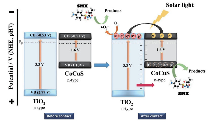 speciesRef. Twinned CuS MB Visible light (λ > 420 nm) 95% (50 min) 8 90% ·OH [45] CuS@CNs 2,4-Dichlorophenol Simulated sunlight 90% (2.5 h) 5 85% ·OH [46] TiO2/CuS(3∶1) Tetracycline Simulated sunlight 97.99% (1 h) 4 92% ·O2- [47] Co-CuS@TiO2 Sulfamethoxazole Simulated sunlight 95% (4 h) 6 82% ·OH/·O2- [11] -