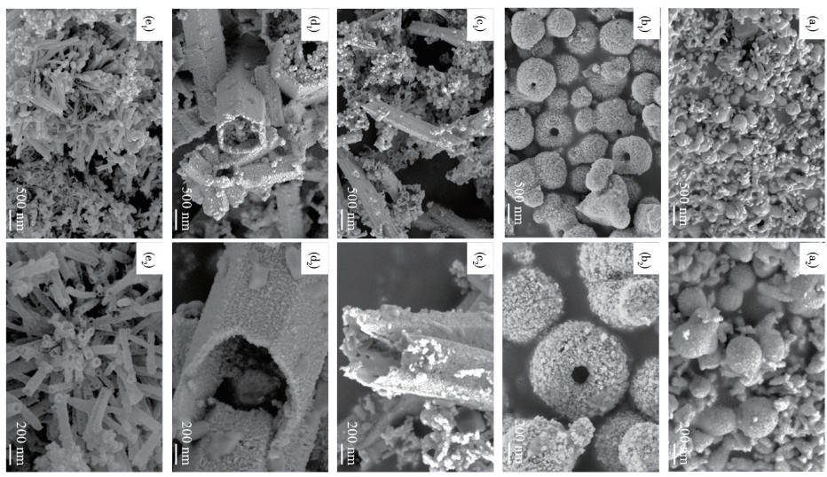 本课题组Cao等[17]通过水热法在EG(乙二醇)/H2O混合溶剂中合成了Zn掺杂CuS多孔纳米管(以Cu(NO3)2·3H2O、Zn(NO3)2·6H2O、Na2S2O3为原料,80 ℃反应2.5 h)。通过调控EG浓度,实现了产物形貌从球形颗粒向多孔纳米管(直径约为100 nm,壁厚约为30 nm)的演变,SEM结果如图 3所示。XRD显示六方CuS的衍射峰发生轻微偏移,这源于Zn2+对Cu2+的晶格取代。该材料在光催化降解10 mg·L-1 MB的实验中,可见光照射1 h后的降解效率达到96%,且循环稳定性优异。这证实了由EG调控的形貌优化增加了活性位点,而Zn掺杂则有效提升了电导率并抑制了电子-空穴对的复合,直接验证了水热法在制备离子掺杂CuS方面的应用价值。