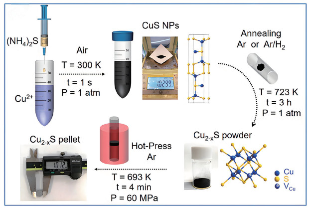 退火法通过加热、保温和冷却过程释放材料内应力,改善均匀性,常用于金属氧化物改性。在能源领域,退火法已用于CuS基热电材料工程。Bekenstein等[21]采用热退火法(350~400 K)处理Cu2S纳米晶阵列,通过形成Cu空位实现p型掺杂,使电导率提升了6个数量级,功率因子达0.1 mW·mK-2。该方法可通过激光局部加热实现图案化掺杂,在新能源领域有望用于微型热电发电机和柔性电子器件的高效能源转换模块。Li等[22]研究了退火气氛对Cu2-xS热电性能的调控:在Ar气氛下得到菱形Cu1.8S,在H2气氛下得到四方Cu1.96S,于710 K时ZT值达1.41。该材料成本低,稳定性高,在工业余热回收和分布式能源系统中具有应用潜力,并可通过印刷技术制备柔性热电器件(图 4)。