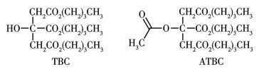 柠檬酸三丁酯(tributyl citrate,TBC)是由柠檬酸(citric acid,CA)与正丁醇反应生成的一种无毒、耐光、具有优异耐热性[11]和耐菌性[12]的可降解三元酯类化合物[13](图 1)。乙酰柠檬酸三丁酯(acetyl tributyl citrate,ATBC)是TBC的乙酰化产物(图 2),二者均具有良好的增塑效果和相容性,是PAEs的安全替代品之一[14]。TBC和ATBC已被美国食品药品监督管理局(FDA)批准为无毒增塑剂,可用于儿童玩具、食品包装、个人卫生用品及医疗器械等塑料制品,并广泛应用于聚氯乙烯(PVC)、氯乙烯-偏二氯乙烯(PVDC)共聚树脂、聚丙烯(PP)、聚乙烯(PE)及纤维制品[15]。