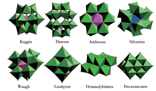 传统的TBC合成工艺以浓硫酸为催化剂,虽然其价格低廉、工艺成熟,但存在腐蚀设备、产生大量废液以及产品色度较差等问题[16],因此开发更为绿色环保的TBC生产工艺势在必行。杂多酸(heteropolyacid,HPA)是一类由杂原子(如P、Si等)和前过渡金属(如Mo、W、V、Nb、Ta等)通过桥氧连接所形成孤立的多金属氧酸盐(polyoxometalate,POMs)。其结构类型丰富、组成多变,在催化领域具有独特优势。常见的POMs结构包括Keggin型、Dawson型、Anderson型、Lindqvist型、Waugh型和Silverton型、八钼酸和十钒酸等(图 3)[17]。其中,Keggin型HPA[如硅钨酸(STA)、磷钨酸(PTA)、磷钼酸(PMA)、硅钼酸(SMA)和硼钨酸(BTA)等]是一类固体超强酸,具有酸性强(质子密度高)、结构与性能可调(可通过调控酸性、空间位阻及氧化还原性以优化选择性)、不挥发、热稳定性高、负载后不易失活等优点[18],被广泛应用于催化氧化[19]、氧化脱硫[20]、酯交换[21]等反应,是一种新型绿色环保催化剂。尽管HPA催化性能优异,但其价格昂贵且在均相体系中难以回收,限制了其工业应用。将HPA负载于合适的载体上构建非均相催化剂,可同时解决催化剂回收与酸性位点充分利用之间的矛盾[22]。近年来,多种负载型HPA催化剂已被用于TBC的合成,本文总结了该领域的研究进展。