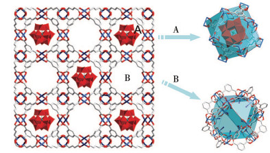 Sun等在2009年报道了以MOF为载体负载HPA所构建的新型多金属氧酸盐MOF(POMOF)材料[Cu2(BTC)4/3(H2O)2]6[HnXM12O40]·(C4H12N)2(X=Si、Ge、P、As;M=W、Mo),其将Keggin型HPA限域在Cu-BTC的A型孔中(图 4),可用于催化酯的水解反应,并且对乙酸甲酯和乙酸乙酯具有较高催化活性,而对苯甲酸酯等较大分子酯类的催化活性显著降低[70]。