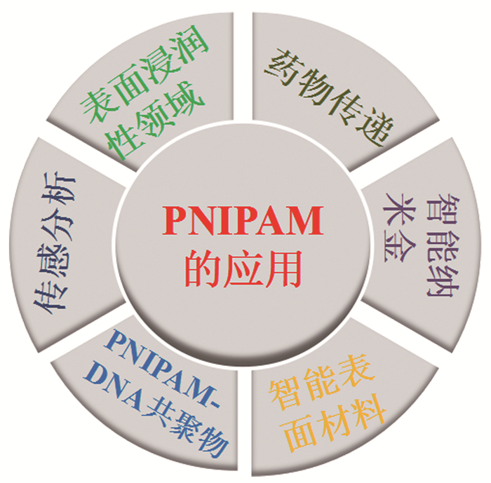 PNIPAM由于其独特的性质而被广泛应用于药物传递、智能化纳米金、智能化表面材料、共聚物、传感分析及表面浸润性等领域(图 1)。