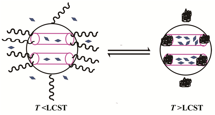 2008年,You等[32]通过RAFT聚合制备PNIPAM,再通过己胺的氨解作用将末端的三硫代酯还原为巯基,然后与二吡啶基二硫醚作用结合为末端为二硫吡啶的PNIPAM-S-S-Py聚合物。在实验中,他们通过正硅酸乙酯与巯基丙基三甲氧基硅烷作用,制备了孔壁修饰巯基链的微小介孔二氧化硅纳米颗粒(MSN-SH),并与PNIPAM-S-S-Py作用最终制得MSN-PNIPAM温敏性纳米颗粒。MSN-PNIPAM于室温下可以负载荧光素,若温度在LCST以上,PNIPAM塌陷为球形,回缩至孔壁,堵住微孔孔洞,阻止荧光素外泄;若温度在LCST以下,PNIPAM自由膨胀,打开孔洞,荧光素释放。这种方法可以用于药物的释放或基因的传递,简单示意如图 2所示。
