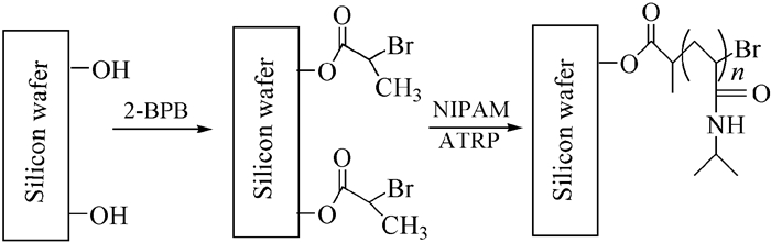 2010年,Caykara等[29]通过引发剂固定反应将2-溴丙酰溴固定在覆盖羟基的亲水硅片表面,再利用SI-ATRP技术,成功地在硅片表面自组装上分布均匀的PNIPAM聚合物刷(如图 3)。不同于水溶液中PNIPAM聚合物的相转移温度在一个较窄范围内,这种接枝在材料表面的干燥的聚合物刷其相转移温度范围较宽,且分为两个阶段。第一个相转变温度在27℃,是由靠近硅片表面的聚合物刷内部区域的PNIPAM塌陷造成的,此区域的PNIPAM密度较高,使得PNIPAM链间链内的作用都较强,故而在较低温度时即可先引发此区域PNIPAM的构象变化。第二阶段相转变温度在38℃,是由远离硅表面的聚合物刷外部区域的PNIPAM塌陷造成的,此区域链稀疏密度较低,链间的作用较弱,故而相转变温度也较高。这种通过表面引发自由基聚合制备的PNIPAM聚合物刷可用作可调型智能化表面材料。