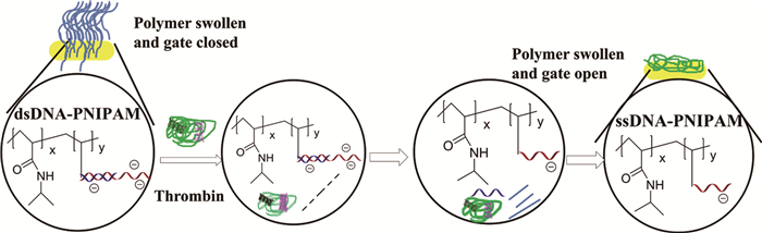 2015年,Yamaguchi等[42]通过在多孔基质孔隙接枝PNIPAM与包含凝血酶适配体的ssDNA的共聚物制备了分子识别门控膜。共聚的DNA在起始部位与凝血酶适配体形成双链结构,dsDNA带有较多的负电荷,DNA链间较强的静电作用使聚合物膨胀,孔隙呈关闭态;当溶液中存在凝血酶时,凝血酶与适配体强有力的识别使dsDNA解链成ssDNA,DNA间的静电斥力降低,从而使得接枝的PNIPAM收缩,孔隙释放,如图 4所示。通过改变接枝的适配体可使分子识别膜用于多种分子的识别,所以这种分子识别膜作为传感和药物输送系统在环境和药物领域极具发展潜力。